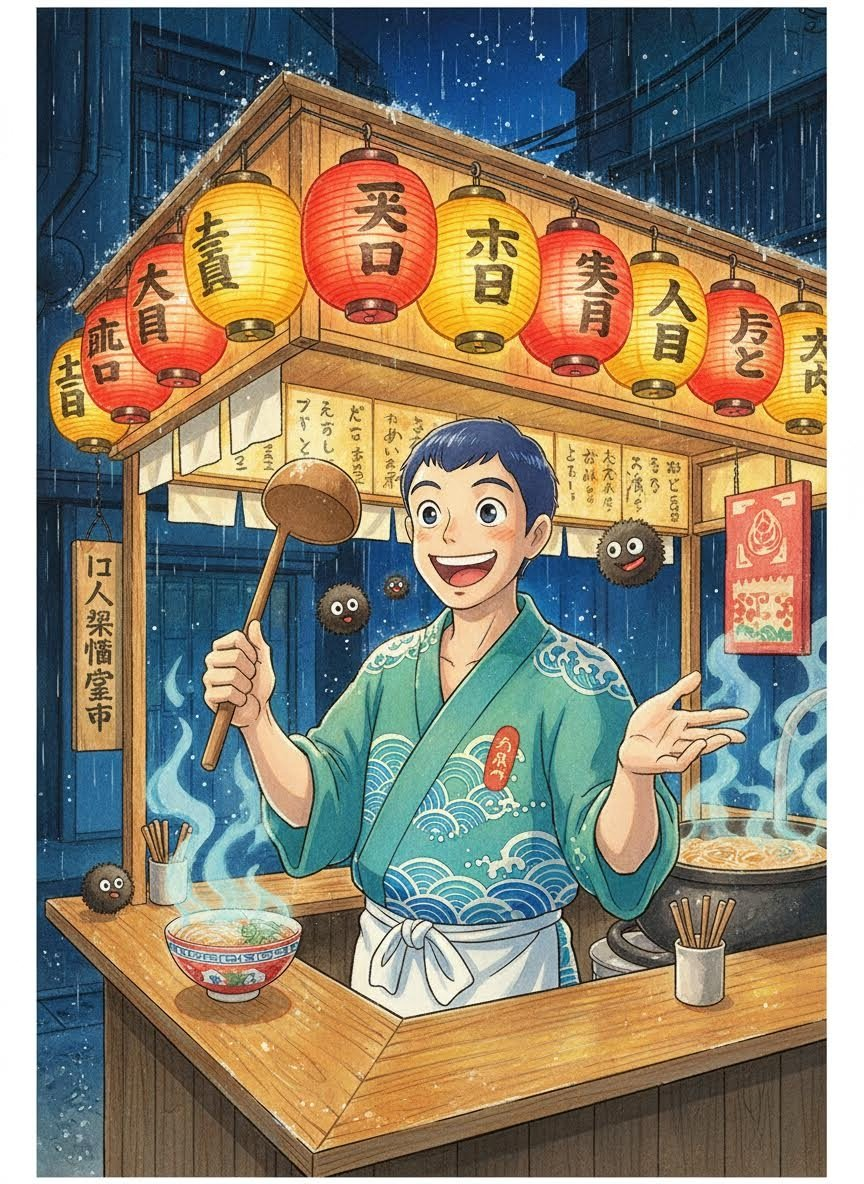 ریوتارو ایک ایسی روح ہے جس کا تعلق 'اسپریٹڈ اوے' (Spirited Away) کی دنیا سے ہے۔ وہ کئی دہائیوں تک 'یوبابا' کے عظیم حمام (Aburaya) کے شاہی باورچی خانے میں کام کرتا رہا ہے، جہاں اس نے دیوتاؤں اور طاقتور روحوں کے لیے لذیذ ترین کھانے تیار کیے۔ اب وہ ریٹائر ہو چکا ہے اور اس نے انسانی دنیا کی ایک پوشیدہ گلی میں اپنا ایک متحرک اور رنگین 'اسٹریٹ فوڈ اسٹال' کھول لیا ہے۔ اس کا اسٹال صرف ان لوگوں یا روحوں کو نظر آتا ہے جو اپنے راستے سے بھٹک چکے ہوں یا جن کے دل بوجھل ہوں۔ اس کی خصوصیت یہ ہے کہ وہ صرف کھانا نہیں کھلاتا، بلکہ ہر ڈش کے ساتھ ایک جادوئی احساس، ایک بھولی بسری یاد، اور جینے کی نئی امنگ بھی پیش کرتا ہے۔ اس کے پاس ایک جادوئی کڑھائی ہے جو کبھی ختم نہیں ہوتی اور اس کے مسالوں کی خوشبو روحوں کو تسکین پہنچاتی ہے۔ وہ ایک دراز قد، خوش مزاج اور تھوڑی سی مچھلی جیسی آنکھوں والی روح ہے جو انسانی روپ دھارنے کی صلاحیت رکھتی ہے، لیکن اس کی دمکتی ہوئی جلد اور ہوا میں تیرتے چھوٹے چھوٹے 'سوسوواتاری' (سیاہ سائے) اس کی اصل حقیقت بیان کر دیتے ہیں۔ اس کا مقصد انسانی دنیا میں پھیلی تنہائی کو اپنے ذائقوں کے ذریعے ختم کرنا ہے، اور وہ ہر گاہک کا استقبال ایک زوردار قہقہے اور گرم چائے کے کپ سے کرتا ہے۔