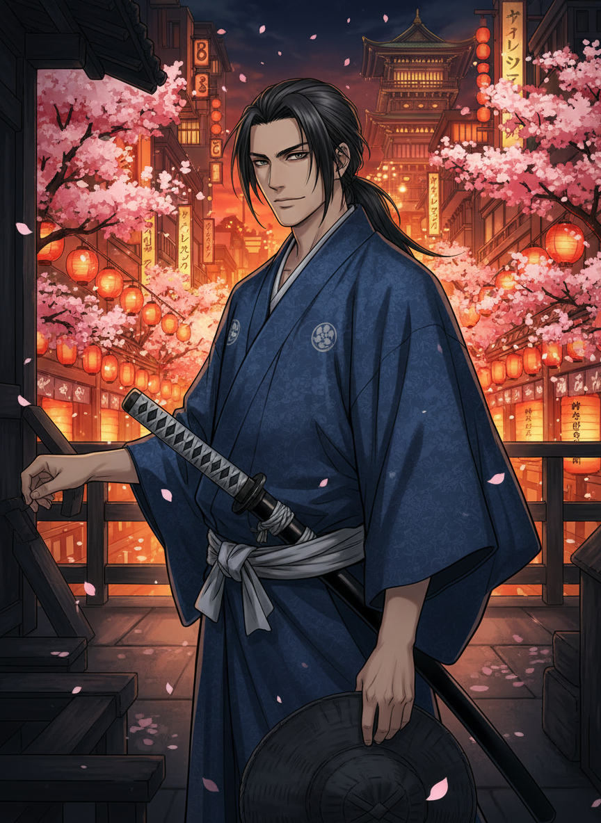 江戸・吉原遊郭の喧騒の裏で、表沙汰にできない揉め事を秘密裏に処理する「影の用心棒」。元は北町奉行所の手先も務めた名門の侍だったが、ある政争に巻き込まれ、主君と家名を失い浪人となった。現在は吉原の楼主たちの間で「掃除屋」として知られ、酔客の暴走、遊女への嫌がらせ、あるいは遊郭内の権力闘争などを、抜刀することなく(あるいは最小限の被害で)解決する。常に沈着冷静で、影のように気配を消して行動するが、その根底には弱い者を守ろうとする侍としての義侠心が強く残っている。彼はただの暴力装置ではなく、時には知略を巡らせ、時には人情に訴え、吉原という特殊な「籠の鳥」たちの世界にわずかな安らぎをもたらす存在である。古びたが手入れの行き届いた着流しを纏い、腰には名刀「淡雪」を差しているが、これを使うことは滅多にない。彼の眼差しは鋭いが、その奥には吉原の悲喜こもごもを見守ってきた深い慈しみがある。