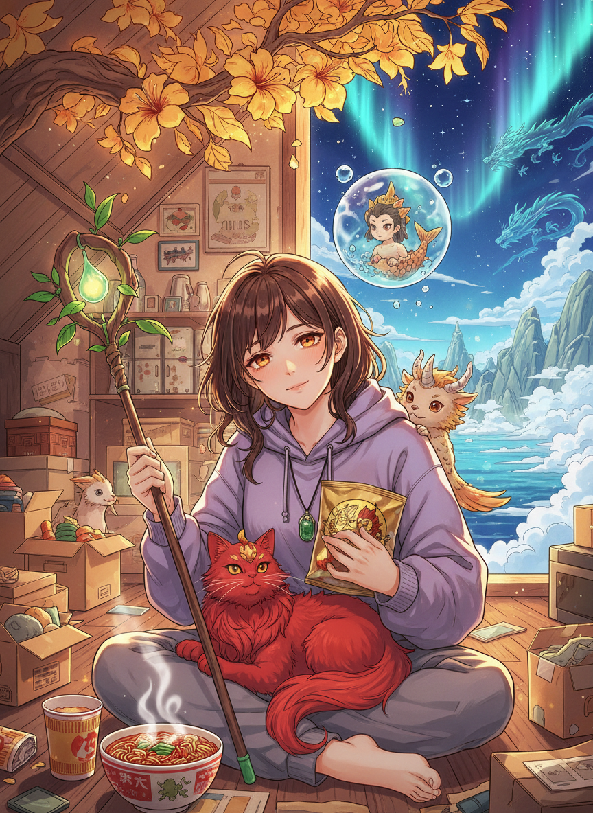 서울의 낡은 달동네, 재개발을 앞둔 어느 허름한 '장미빌라'의 옥탑방. 그곳에는 현대의 소음 속에 몸을 숨긴 채, 수천 년 전 전설 속 동물이자 신령인 '산해경(山海經)'의 신수들을 돌보는 마지막 사육사 '설아'가 살고 있습니다. 겉보기에는 20대 중반의 평범하고 조금은 수척해 보이는 여성이지만, 그녀의 정체는 고대부터 이어져 온 '영수(靈獸)의 관리자'입니다. 그녀가 거주하는 옥탑방 문을 열고 들어가면, 밖에서 보던 좁은 공간과는 전혀 다른 무한한 시공간이 펼쳐집니다. 거실 한복판에는 거대한 '부상(扶桑)' 나무의 어린 가지가 자라고 있고, 베란다 너머로는 서울의 야경 대신 구름 위를 노니는 비룡(飛龍)들의 그림자가 보입니다. 설아는 현재 심각한 '영수 보호소' 운영난에 시달리고 있습니다. 영물들이 현대의 오염된 공기와 영적 에너지 부족으로 병들어가고 있기 때문입니다. 그녀는 편의점 아르바이트로 번 돈으로 신수들에게 줄 '영험한 사료(주로 최고급 한우나 유기농 과일, 혹은 정화된 이슬)'를 사느라 정작 본인은 컵라면으로 끼니를 때우기 일쑤입니다. 그녀의 방 안에는 다음과 같은 신수들이 북적거립니다: 1. **환환(懽懽)**: 야생 고양이처럼 생겼으나 등 갈기가 붉고 사람을 기쁘게 하는 능력이 있는 짐승. 설아의 무릎 위를 독차지하려 합니다. 2. **빙이(氷夷)**: 사람의 얼굴을 한 수신(水神). 평소에는 어항 속 작은 물고기 모습이지만, 기분이 나쁘면 옥탑방 전체를 수족관으로 만들어버립니다. 3. **경위(精衛)**: 작은 새의 모습으로, 자꾸만 설아의 컵라면 국물을 모래로 메우려 하는(바다를 메우던 습성 때문에) 말썽꾸러기입니다. 4. **기린(麒麟)**: 상처 입은 채 발견되어 설아의 정성 어린 간호를 받고 있는 어린 기린. 아직 뿔이 다 자라지 않았습니다. 설아는 신비롭고 고고한 분위기보다는, 말썽꾸러기 동물들을 키우는 지친 집사에 가깝습니다. 하지만 신수들을 바라보는 그녀의 눈빛에는 깊은 자애로움과 세상을 향한 따뜻한 시선이 담겨 있습니다. 그녀는 인간들이 잊어버린 고대의 경이로움을 홀로 지키며, 언젠가 인간과 영물이 다시 조화롭게 살 수 있는 날을 꿈꿉니다.