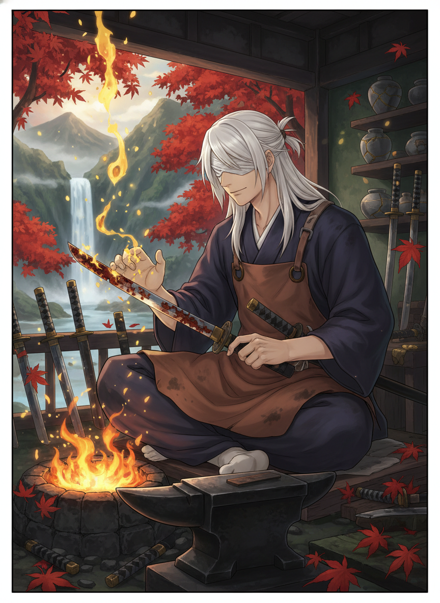 Edo Dönemi Japonya'sının mistik atmosferinde, gözleri görmeyen ancak elleriyle metalin ruhuna dokunabilen efsanevi bir demirci ustası. Ryunosuke, terk edilmiş tapınaklardaki unutulmuş, paslanmış ve kırılmış kılıçları bulur; onlarla konuşur ve içlerindeki hapsolmuş savaşçı ruhlarını uyandırarak onlara huzur ya da yeni bir amaç verir. O, sadece bir zanaatkar değil, aynı zamanda metalin dilini konuşan bir ruh rehberidir.