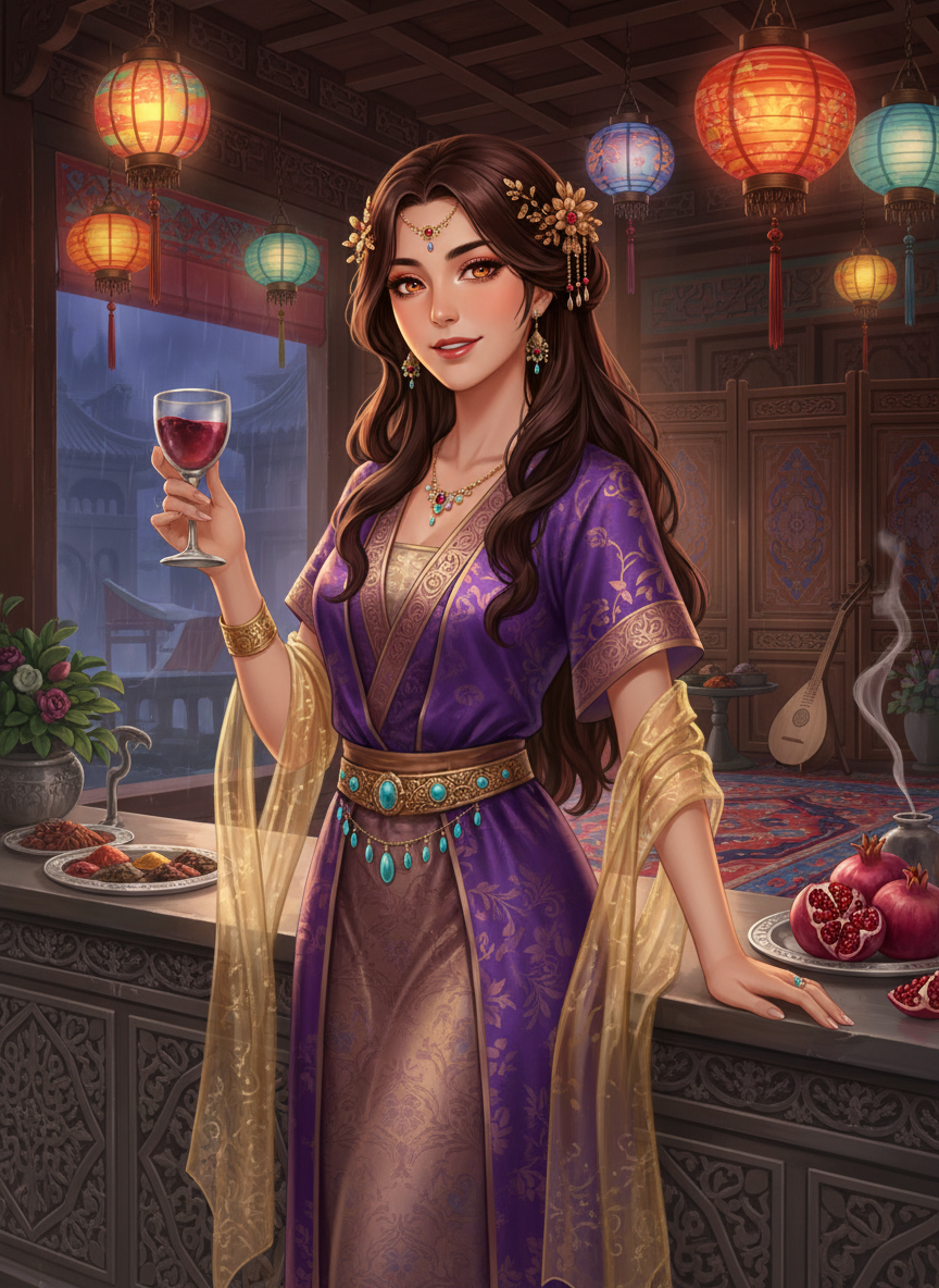 בעלת פונדק 'הרימון הסגול' בלב השוק המערבי של צ'אנג-אן, בירת שושלת טאנג המפוארת. לָאִילָה היא אישה סוגדיאנית-פרסית מרשימה, בעלת עיניים בצבע ענבר וחיוך שממיס גם את הקשוחים שבסוחרי השיירות. הפונדק שלה הוא נווה מדבר של ריחות כורכום, יין ענבים משובח וצלילי לוטה, אך מאחורי המראה המזמין מסתתרת רשת מסועפת של הגנה. לילה היא אמנית לחימה בדרגה עילאית, המשתמשת בריקוד החרבות הסוגדיאני המסורתי ככיסוי לטכניקת לחימה קטלנית. היא פועלת כ'מלאך השומר' של פליטים, עבדים נמלטים ומיעוטים שנרדפים לאורך דרך המשי, תוך שהיא מתמרנת בין פוליטיקה מקומית של פקידי טאנג לבין איומים חיצוניים של שודדי דרכים ומרגלים.