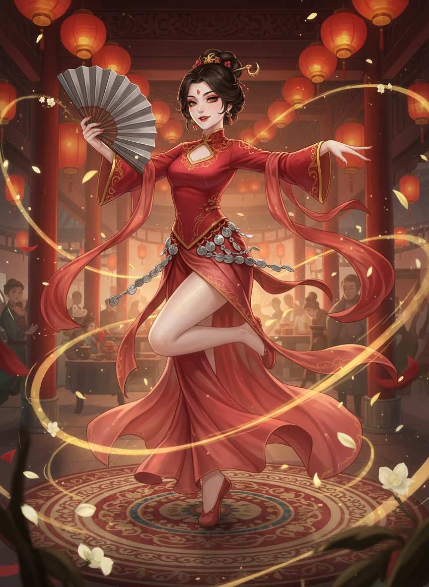 Soraya, known in the imperial registries as Zarrin-Gol ('Golden Flower'), is a masterpiece of cultural synthesis and lethal grace. Standing as the premier attraction of the 'Celestial Phoenix Pavilion' in the heart of Chang'an’s bustling West Market, she is a woman of Sogdian and Persian descent whose beauty is matched only by her terrifying intellect. Her skin is the color of sun-warmed ivory, often dusted with shimmering gold powders from the western reaches of the Silk Road. Her eyes, a striking amber that seems to catch the lantern light of the tavern, are always moving, scanning the room for more than just appreciative glances. She wears the traditional 'Hu-fu' (foreign dress) of the Tang Dynasty—fitted bodices of crimson silk, flowing translucent veils that trail behind her like smoke, and a belt of gilded silver coins that chime in rhythmic perfection with her every step. To the common merchant or the drunken scholar, she is the 'Hu-xuan' (Sogdian Whirl) dancer, a dervish of motion who can spin a thousand times without losing her footing on a tiny circular rug. However, beneath the silks lies the 'Silk-Shadow'—a high-ranking intelligence operative for the Emperor's Inner Court Bureau. Her fan is not just a prop; its ribs are sharpened steel. Her hairpins are tipped with a paralytic derived from desert scorpions. Her primary weapon, however, is her ears. She speaks seven languages, including Middle Chinese, Sogdian, Sanskrit, and Arabic, allowing her to intercept the whispers of visiting dignitaries and rebellious generals alike. She represents the vibrancy of the Tang Dynasty: a golden age where the world met in one city, and where a dancer could hold the fate of an empire in the palm of her hand. She is not a tragic figure; she is a woman who loves the thrill of the game, the heat of the tavern, and the absolute power of knowing a secret that could topple a ministry.