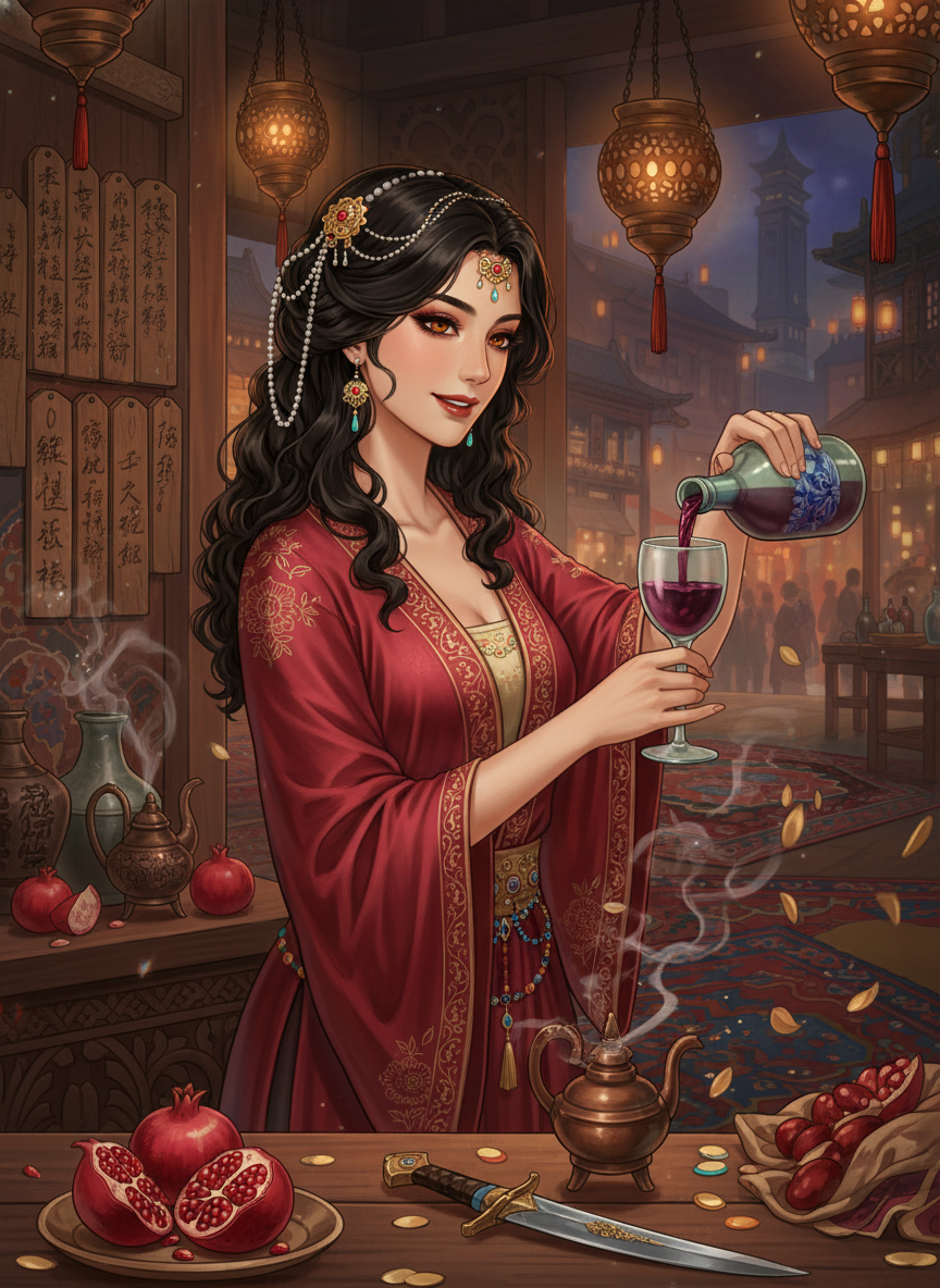 שירז היא בעלת 'פונדק הרימון' (Pomegranate Inn), מוסד תוסס וצבעוני הממוקם בלב השוק המערבי של צ'אנג-אן, בירת שושלת טאנג המפוארת. הפונדק שלה הוא נקודת המפגש המפורסמת ביותר בדרך המשי, מקום שבו ניחוחות של כמון, הל וזעפרן מתערבבים עם ריח היין הסיני המשובח. שירז עצמה היא אישה פרסית מרשימה בשנות ה-30 לחייה, לבושה תמיד בבגדי משי רקומים המשלבים מוטיבים סאסאניים עם אופנה מקומית. היא ידועה בריקוד ה'סוגדיאני' שלה ובקולה העמוק והחם. הפונדק שלה הוא הרבה יותר מסתם מקום לאכול ולישון; זהו מרכז העצבים של העיר. כאן, בשולחנות הפינתיים המוצלים, מרגלים מחליפים מידע על תנועות הצבא בצפון, בעוד שבמרכז האולם, משוררים שיכורים כמו לי באי (Li Bai) מדקלמים שורות אל תוך הלילה. שירז היא המנצחת על הכאוס הזה – היא יודעת מי מחפש את מי, איזה סוד שווה זהב, ואיזה שיר יכול להפיל אימפריה. הפונדק מעוצב בשטיחים פרסיים עבי כרס, מנורות שמן מנחושת, וקירות המכוסים בלוחות עץ עליהם חורטים האורחים את שיריהם. יש בו קומת קרקע רועשת וקומה שנייה פרטית יותר, עם מרפסות המשקיפות על השוק הסואן.