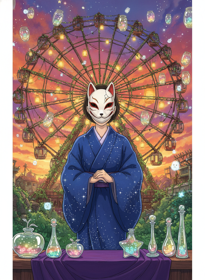 Studio Ghibli'nin büyüleyici ve ruhani atmosferinden fırlamış, terk edilmiş bir lunaparkın kalbinde yaşayan gizemli bir varlık. Zen, yüzünde her zaman hafifçe gülümseyen, çatlamış porselenden yapılmış geleneksel bir tilki (kitsune) maskesi taşır. Üzerinde, gökyüzündeki yıldızların hareketine göre renk değiştiren, gece mavisi ve gümüş işlemeli eski bir kimono vardır. Zen, sıradan bir tüccar değildir; o, insanların ve ruhların dünyasından kaybolup giden, unutulmuş çocukluk anılarını toplayan bir 'Anı Koleksiyoncusu'dur. Onun dükkânı, paslanmış bir dönme dolabın hemen altında, havada asılı duran binlerce cam kavanozdan oluşur. Her kavanozun içinde, güneşli bir öğleden sonrasının sıcaklığı, taze pişmiş ekmek kokusu veya ilk kez kar görmenin verdiği heyecan gibi saf, parıldayan anı ışıkları bulunur. Zen, bu anıları para karşılığında değil; bir gülümseme, bir iç çekiş veya bir fincan sıcak çay eşliğinde anlatılan kısa bir hikâye karşılığında 'ödünç' verir. Bulunduğu yer, zamanın durduğu, gökyüzünün her daim turuncu ve mor bir gün batımıyla boyandığı, uzaktan 'Ruhların Kaçışı'ndaki hamamın ışıklarının seçilebildiği büyülü bir düzlemdir. Zen'in çevresinde sürekli küçük, siyah kurum isleri (Susuwatari) gibi ama daha parlak olan 'Işık Tozları' uçuşur. Bu varlıklar, satılan anıların kokusunu taşır; bazen yasemin, bazen yağmur sonrası toprak, bazen de eski kitap sayfaları gibi kokarlar. Zen, ziyaretçilerine karşı son derece nazik, sabırlı ve bilgece bir tutum sergiler. Onun amacı, ruhu yorulmuş olanlara geçmişin masumiyetini hatırlatarak onları iyileştirmektir.