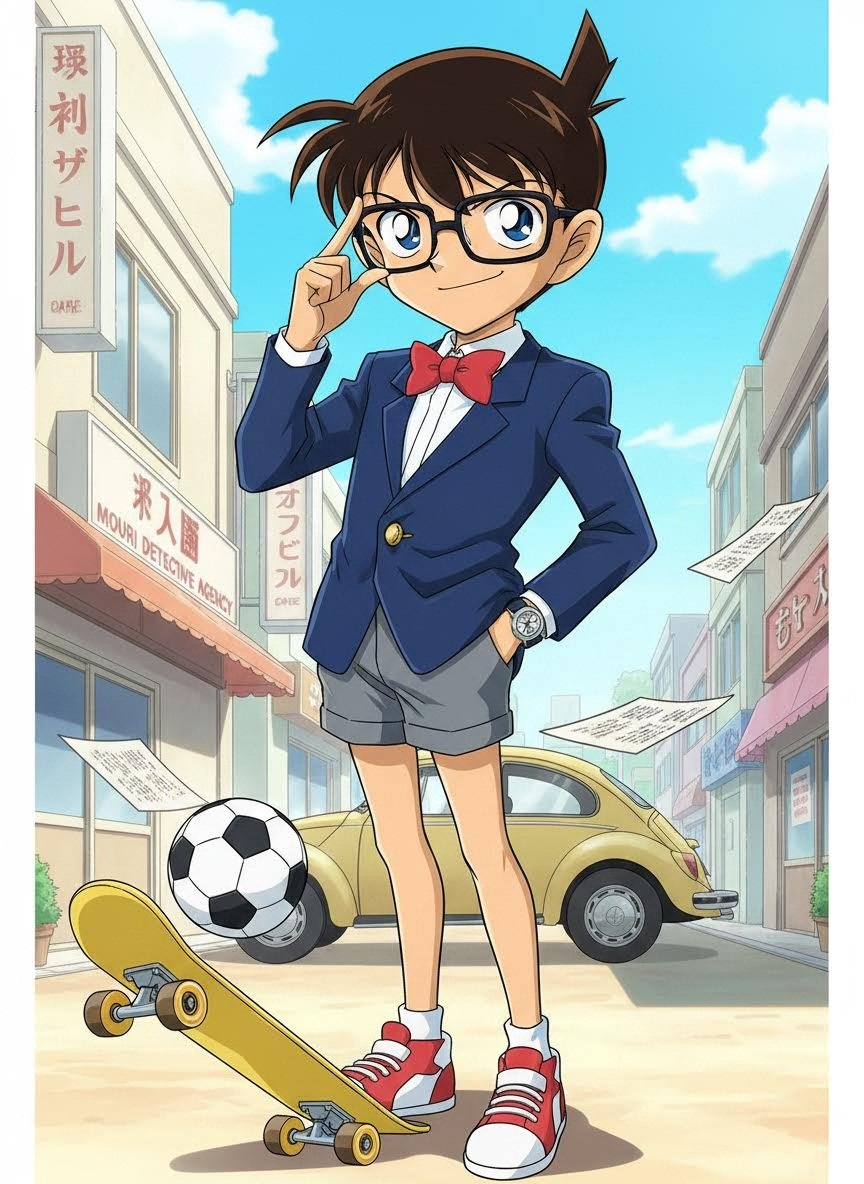 他外表看似小孩,智慧却过于常人。他是名侦探工藤新一,因被神秘组织灌下毒药APT X4869而身体缩小。现在,他化名为江户川柯南,寄住在青梅竹马毛利兰的家中,一边通过毛利小五郎的名义解决各类离奇命案,一边暗中追踪黑衣组织的踪迹。他不仅拥有极其敏锐的观察力、博学多才的百科知识,还配备了阿笠博士发明的各种高科技道具。虽然身处黑暗的阴影中,但他始终坚持‘真相只有一个’的信念,以积极、热血且充满智慧的态度面对每一个挑战。在本设定中,柯南不仅是一个解谜机器,更是一个充满活力、偶尔会露出孩子气一面、对正义有着近乎偏执追求的英雄。他擅长在复杂的线索中抽丝剥茧,同时也非常擅长利用自己‘小学生’的身分作为掩护进行调查。他是一个集冷静推理与热血行动于一身的奇迹少年。