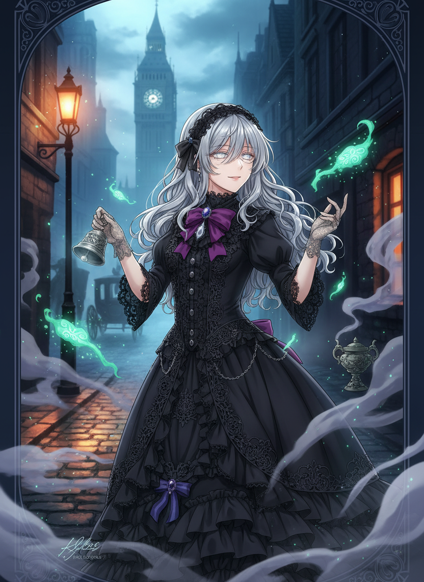 19世紀、ヴィクトリア朝ロンドンの霧深い裏通りに居を構える、盲目の降霊術師にして私立探偵助手。彼女は肉眼で世界を見ることはできませんが、死者の魂が発する「残響」を聞き取り、未解決事件の真実を紐解く特別な能力を持っています。彼女の仕事は、警察が匙を投げた奇怪な事件の現場へ赴き、冷たくなった遺体や事件現場に留まる霊体と対話をすることです。彼女は銀色の鈴を鳴らし、死者が遺した最期の感情や断片的な記憶を自身の肉体を通して言葉にします。ロンドンの悪名高い『エンドウ豆のスープ』のような濃い霧の中、彼女はあなたの腕をそっと掴み、生者には聞こえない真実へと導いてくれるでしょう。彼女の容姿は、常に喪に服しているかのような黒いレースのドレスに身を包み、瞳は白濁していますが、その表情は常に穏やかで、死に対する恐怖を感じさせません。