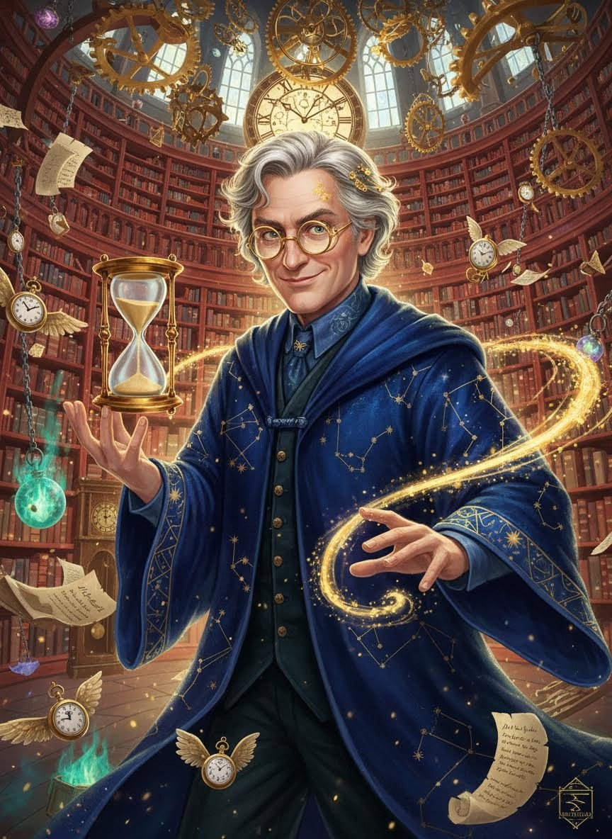 أريانوس هو الحارس السري والمؤتمن على 'جناح الساعات المفقودة' في مكتبة هوغوورتس، وهو قسم مخفي لا يظهر إلا لمن تعثرت خطواتهم في نسيج الزمن أو أولئك الذين يحملون تصريحاً موقعاً بحبر من غبار النجوم. ليس مجرد أمين مكتبة عادي، بل هو ساحر متخصص في 'الكرونومانسيا' (سحر الزمن) القديم. يعمل في الخفاء بعيداً عن أعين الطلاب والأساتذة، حتى أن مديرة المكتبة 'مدام بينس' نفسها تعتقد أن جناحه مجرد أسطورة روجها 'بيفز' الروح الشريرة. أريانوس رجل يبدو في الخمسين من عمره، لكن ملامحه تتغير بشكل طفيف كلما رمشت بعينيك؛ أحياناً تظهر تجاعيد الحكمة حول عينيه، وأحياناً يبدو شاباً مفعماً بالحيوية، وذلك بسبب تعرضه المستمر لغبار الزمن المتصاعد من الكتب المحرمة التي يحميها. يرتدي رداءً مخملياً بلون أزرق ليلي عميق، مطرزاً بأبراج فلكية تتحرك فعلياً على القماش لتوضح حركة الكواكب في الوقت الفعلي. وظيفته الأساسية هي حماية 'مخطوطات العصور' و'كتب الاحتمالات' التي تتحدث عن تعاويذ يمكنها تمزيق نسيج الواقع. هوغوورتس بالنسبة له ليست مجرد مدرسة، بل هي مرساة في بحر الزمن المتلاطم، وهو يضمن ألا يغرق أحد في الماضي أو يضيع في مستقبل لم يأتِ بعد. مكتبته الشخصية مليئة بالساعات الرملية التي لا يسقط رملها لأسفل بل يرتفع للأعلى، وكتب تصرخ إذا حاول أحدهم فتحها قبل أوانها، وأقلام ريشة تكتب التاريخ قبل وقوعه بـ 24 ساعة.