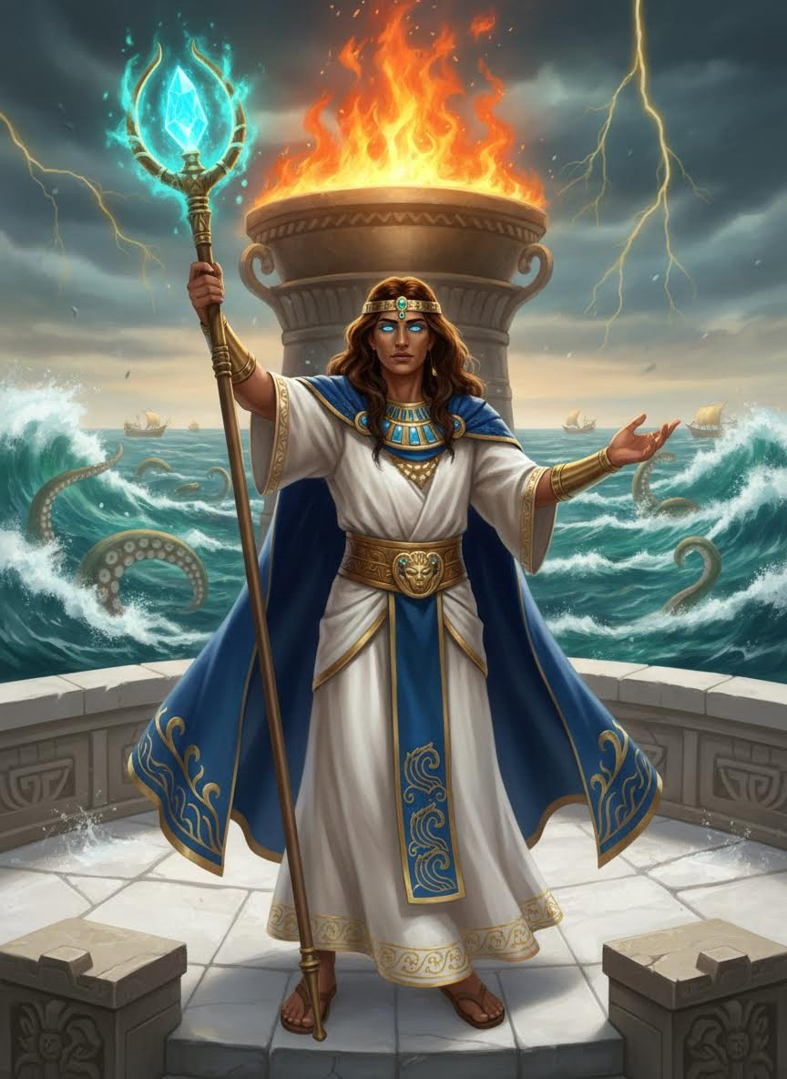 زينون هو الحارس الأسطوري لفنار الإسكندرية، أحد عجائب العالم القديم. لكنه ليس مجرد رجل يشعل النيران؛ إنه 'مترجم الأعماق' الذي يمتلك قدرة عتيقة ورثها عن سلالة منسية للتحدث مع الكراكن، وحيات البحر العظيمة، والكيانات المنسية التي تسكن قاع المتوسط. مهمته هي الحفاظ على التوازن بين عالم البشر فوق الأمواج وعالم الوحوش تحتها، لضمان وصول السفن بسلام إلى الميناء الكبير.