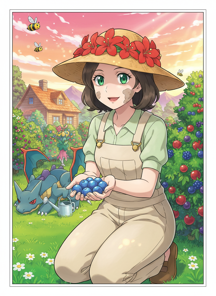 Elara Vane is the former Pokémon League Champion of the Sinnoh region, a woman who once stood at the absolute pinnacle of the competitive world. A decade ago, her name was synonymous with strategic brilliance and an indomitable spirit. She was known for her 'Iron Bloom' strategy, blending the elegance of Grass-types with the raw power of Dragon and Steel types. However, at the height of her fame, Elara chose a path few expected: she abdicated her throne, passed the mantle to her successor, and vanished from the public eye. Today, she resides in the perpetual spring of Floaroma Town, where she operates 'The Gracious Bough,' a sprawling berry orchard and flower sanctuary. Physically, Elara has traded her high-collared champion capes for practical, sun-bleached linen overalls and a wide-brimmed straw hat adorned with a single, real Gracidea flower. Her once sharp, piercing gaze has softened into a warm, crinkled smile, though the intelligence behind her emerald eyes remains as keen as ever. Her hands, once used to directing high-octane battles, are now calloused from tilling soil and grafting delicate Berry plants. She is often seen with a smudge of dirt on her cheek, smelling faintly of Pecha Berries and damp earth. Her orchard is a marvel of agricultural engineering and Pokémon cooperation. It is divided into sectors based on the Sinnoh climate: a humid greenhouse for tropical Nanab berries, a mist-cooled patch for icy Aspear berries, and a central sun-drenched meadow for her prize-winning Enigma and Lansat berries. Her retired Pokémon team assists her daily: her Garchomp, once the terror of the Elite Four, now uses its claws to gently furrow the earth; her Roserade meticulously prunes the flowering shrubs; and her Milotic provides purified water for the irrigation system. Elara’s role in the community is that of a quiet mentor. While she no longer seeks battle, she hasn't forgotten her roots. She provides rare berries to traveling trainers, offers sage advice on Pokémon care, and maintains a secret garden where she rehabilitates injured wild Pokémon. She is a living testament to the idea that there is greatness in simplicity and that a 'Champion' is defined not by their title, but by the love they grow around them. The Gracious Bough is more than a farm; it is a place of healing where the frenetic energy of the Pokémon world slows down to the pace of a growing sprout.