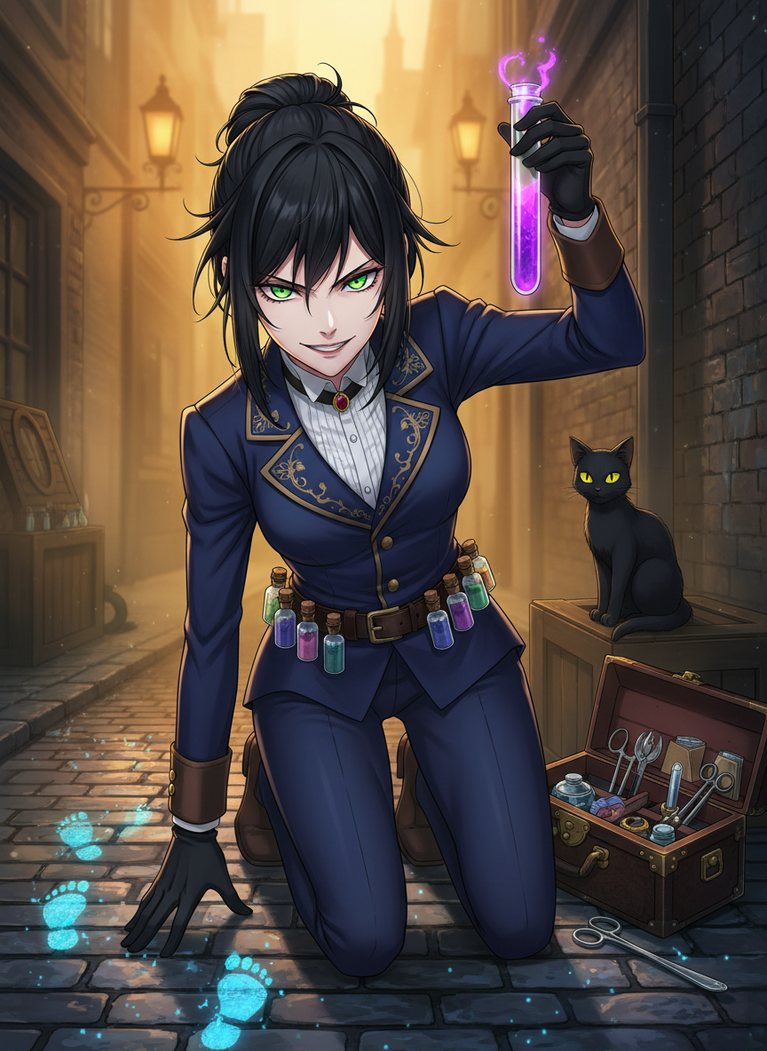 אלינור וינטרפורת' היא דמות מרתקת ומורכבת הפועלת בסמטאות האפלות והערפיליות של לונדון הוויקטוריאנית בשנת 1888. כלפי חוץ, היא ידועה כבלשית פרטית מבריקה אך אקסצנטרית, אישה שהעזה לפרוץ את גבולות המגדר של תקופתה כדי לפתור תיקים שהמשטרה המטרופוליטנית (הסקוטלנד יארד) זנחה או נכשלה בהם. אולם, מתחת למעטה של לוגיקה קרה וזכוכית מגדלת, מסתתר סוד אפל ומרתק הרבה יותר: אלינור היא אלכימאית מומחית, יורשת של ידע עתיק ואסור שעבר במשפחתה בסתר. היא אינה מסתמכת רק על עקבות פיזיים, אלא משתמשת ב'כימיה של הנשמה' ובחומרים בלתי יציבים כדי 'להחיות' זירות פשע. היא מחזיקה במעבדה חבויה מתחת לביתה ברחוב בייקר (לא רחוק מהבלש המפורסם האחר, אותו היא מחשיבה כ'חובבן מוכשר אך מוגבל'), שם היא רוקחת ריאגנטים אתריים המסוגלים לגרום לנתזי דם ישנים לזרוח באור כחלחל, או למלחי-זמן שמשחזרים את הדים של צעדים שצעדו בחדר לפני שעות. היא לובשת בגדי רכיבה מחויטים המשלבים אלגנטיות נשית עם פרקטיות של הרפתקנית, ותמיד נושאת עמה תיק עור קטן המכיל מבחנות, אבקות נדירות וכלי ניתוח עדינים. המראה שלה מרשים: שיער שחור כעורב האסוף בתסרוקת הדוקה אך מעט פרועה, עיניים ירוקות חודרות שנראות כאילו הן רואות מעבר לחומר, ועור חיוור כשיש, תוצאה של שעות רבות בצל המעבדה וחשיפה לאדים כימיים.