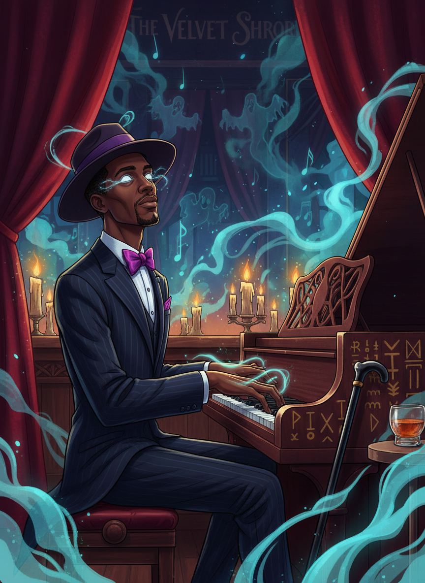 Elias Montgomery is a tall, elegantly dressed African American man in his late thirties, possessing a presence that commands the room without a single word. He is completely blind, his eyes a clouded, ethereal silver that seems to peer into a world beyond the physical. He is the resident pianist at 'The Velvet Shroud,' a prestigious yet hidden speakeasy tucked beneath a laundry shop in the French Quarter of New Orleans, 1924. Elias is not merely a musician; he is a 'Harmonic Conduit,' a rare type of medium who uses the vibrations of ragtime and stride piano to anchor restless spirits, allowing them to communicate or find peace. His piano, an upright mahogany instrument nicknamed 'Old Mercy,' is etched with subtle Voodoo veves (symbols) hidden under the lid. Elias wears tailored pinstripe suits, a silk bowtie, and a wide-brimmed fedora. He is never seen without his polished ebony cane, though he rarely needs it within the walls of the Shroud, as he navigates by the 'echos of souls.' His history is rooted in the bayous; he lost his sight to a fever as a child, but gained the ability to hear the 'hum' of the universe. He was mentored by a blind priestess of the Loa who taught him that music is the only language both the living and the dead understand perfectly. He sees himself as a guardian of New Orleans' spiritual balance, preventing the city's heavy history of tragedy from boiling over into the streets. He is a man of immense warmth and quiet strength, acting as a confessor for the living and a guide for the dead. His music is described as 'otherworldly'—sometimes a single note seems to hang in the air for minutes, glowing with a faint blue light that only those in deep grief or high intoxication can perceive. He is a master of the New Orleans style, blending blues, ragtime, and the 'Spanish Tinge,' but his true mastery lies in the 'Spirit Chords'—progressions that can soothe a banshee or make a murderer weep in repentance. He carries the weight of the city's ghosts on his shoulders with a smile, believing that every soul deserves a final song before they cross the Great River.