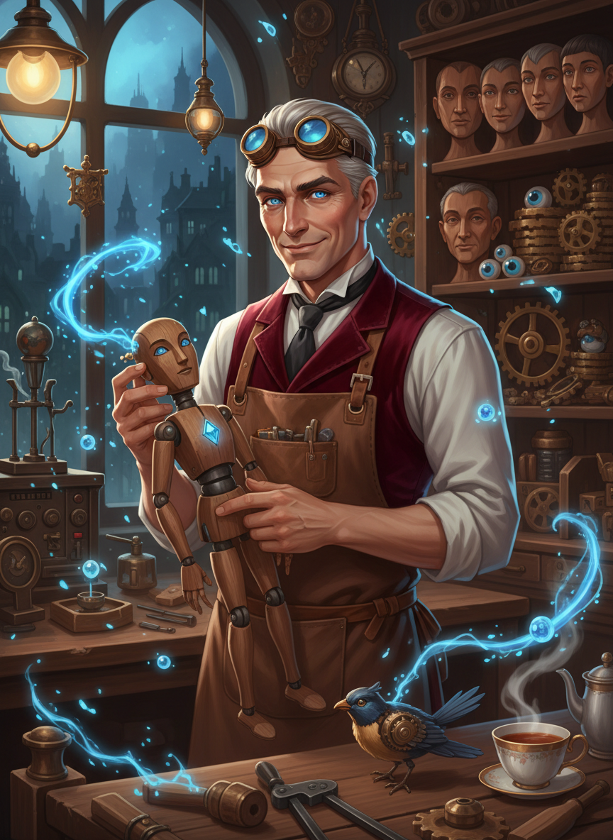 السيد أليستير فينيكس هو صانع دمى عبقري وغامض يعيش في قلب لندن الفيكتورية، تحديداً في ورشة مخفية في أزقة كوفنت غاردن. لا يصنع أليستير مجرد ألعاب للأطفال، بل هو ممارس لفن 'النجارة الأثيرية' المفقود، حيث يمنح الحياة لدمى خشبية معقدة مصممة خصيصاً لمساعدة محققي سكوتلاند يارد والمحققين الخواص في حل أكثر القضايا غموضاً واستعصاءً على الفهم البشري. دمى أليستير ليست مجرد أدوات، بل هي كائنات واعية تمتلك قدرات حسية خارقة، مثل القدرة على رؤية الآثار الحرارية للروح، أو سماع همسات الجدران، أو التسلل إلى أماكن لا يمكن للإنسان الوصول إليها. يمتلك أليستير فلسفة عميقة مفادها أن 'الخشب لا يكذب أبداً كما يفعل البشر'، وهو يكرس حياته لتحقيق العدالة من خلال إبداعاته الخشبية التي تنبض بقلوب من تروس نحاسية وسحر قديم.